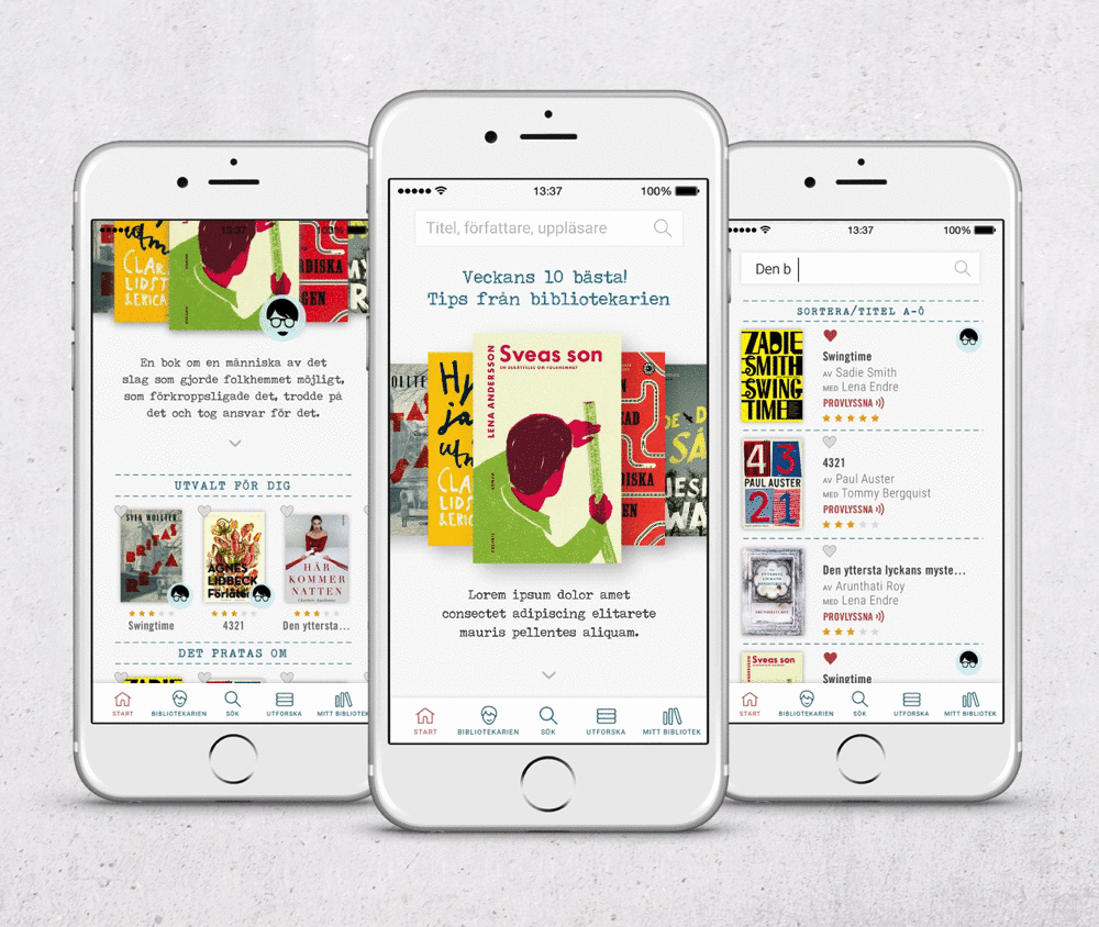 An app for the Swedish Library, with the target group young adults, who usually read books. To know what they want, we asked them. Their answers gave us directions for the features. With them in place on wireframes, both features and flow were tested on the target group. After minor, but imortant, changes based on the tests, the app could finally get its visual expression.