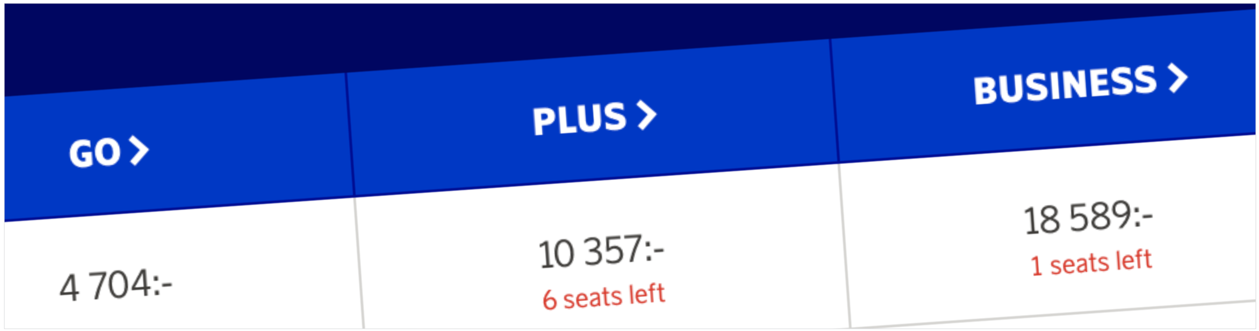 When booking a trip the customer first selects the ”Travel Class” (Go, Plus our Business) in the booking chart. The product cards appear and by selecting one of them the customer gets the desired ”Fare Family”.