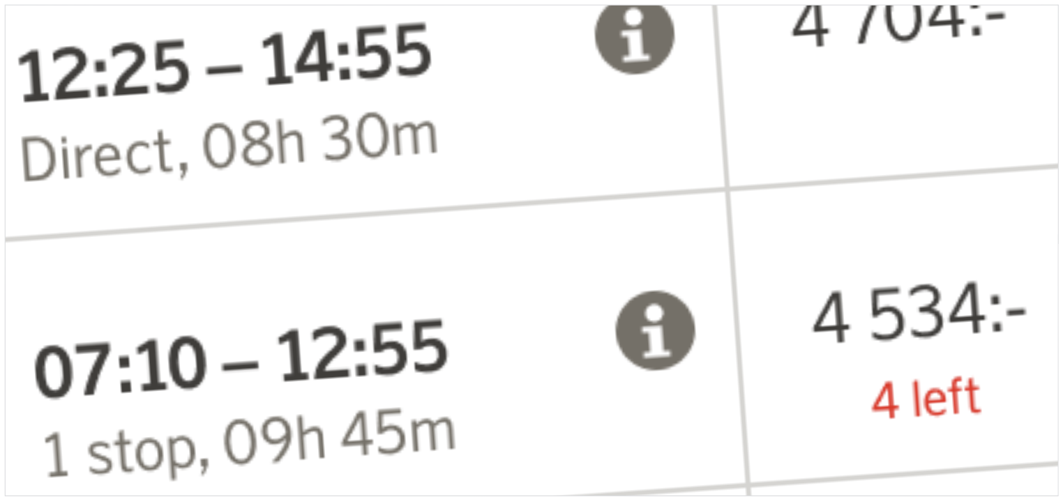 The ”flight bar” got a visual redesign that will also work better in production. To make it easier to scan, the number of stops and duration was moved from the right and placed under the times.
